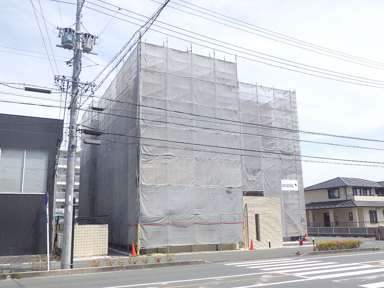 現在、足場解体を行っております。 外観が見えて来ました。 建物名はメゾン・ブロンです。 入居募集しております。 御希望の方は、 KONOIKE Co.㈱ 掛川支店まで TEL(0537)64-3361